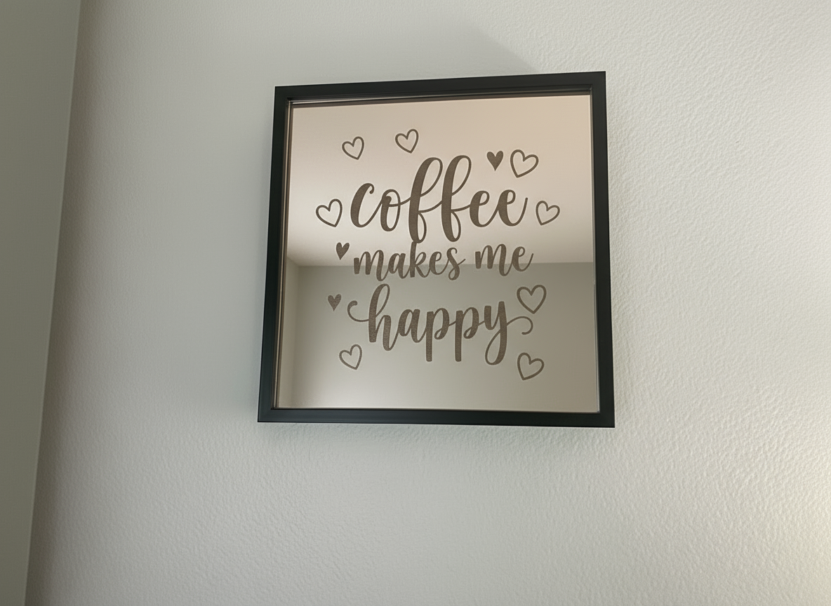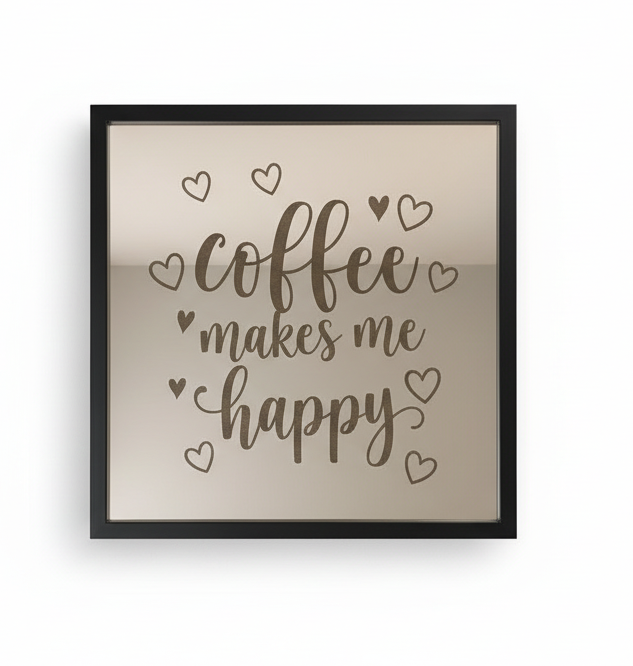 Introducing the Fretmade 12x12 Shadow box - the perfect way to showcase your love for coffee! This beautifully designed box features the phrase "Coffee Makes Me Happy" laser engraved on a 12x12 acrylic mirror, lit by delicate fairy lights. Brighten up your space and indulge in the warm and inviting feeling that only coffee lovers can truly understand.