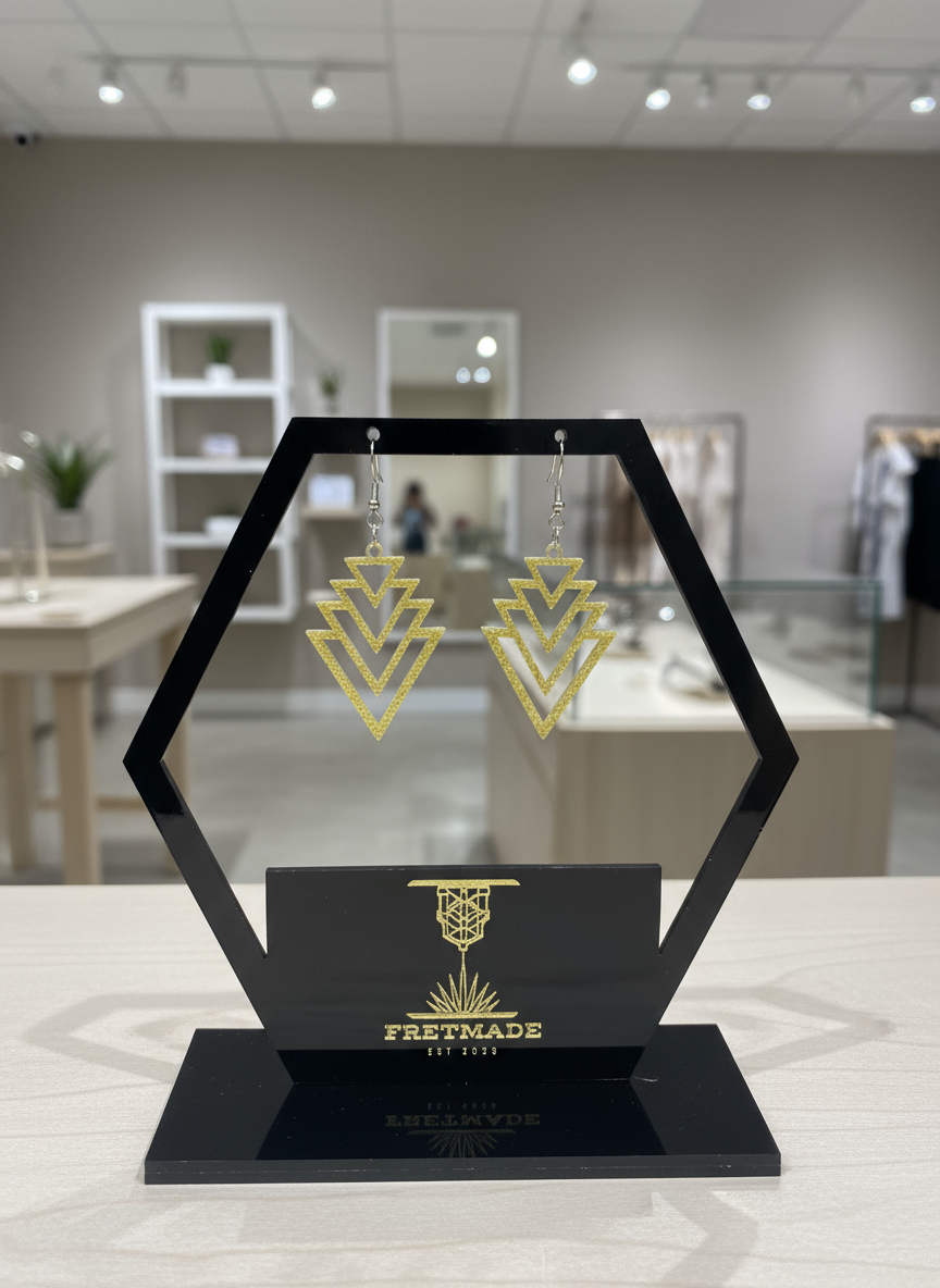 Crafted from high-quality acrylic, these earrings feature a stunning golden geometric shape that is cut to perfection. With its last cut design, these earrings offer a unique and stylish look for any occasion. Elevate your outfit with these modern and elegant earrings.